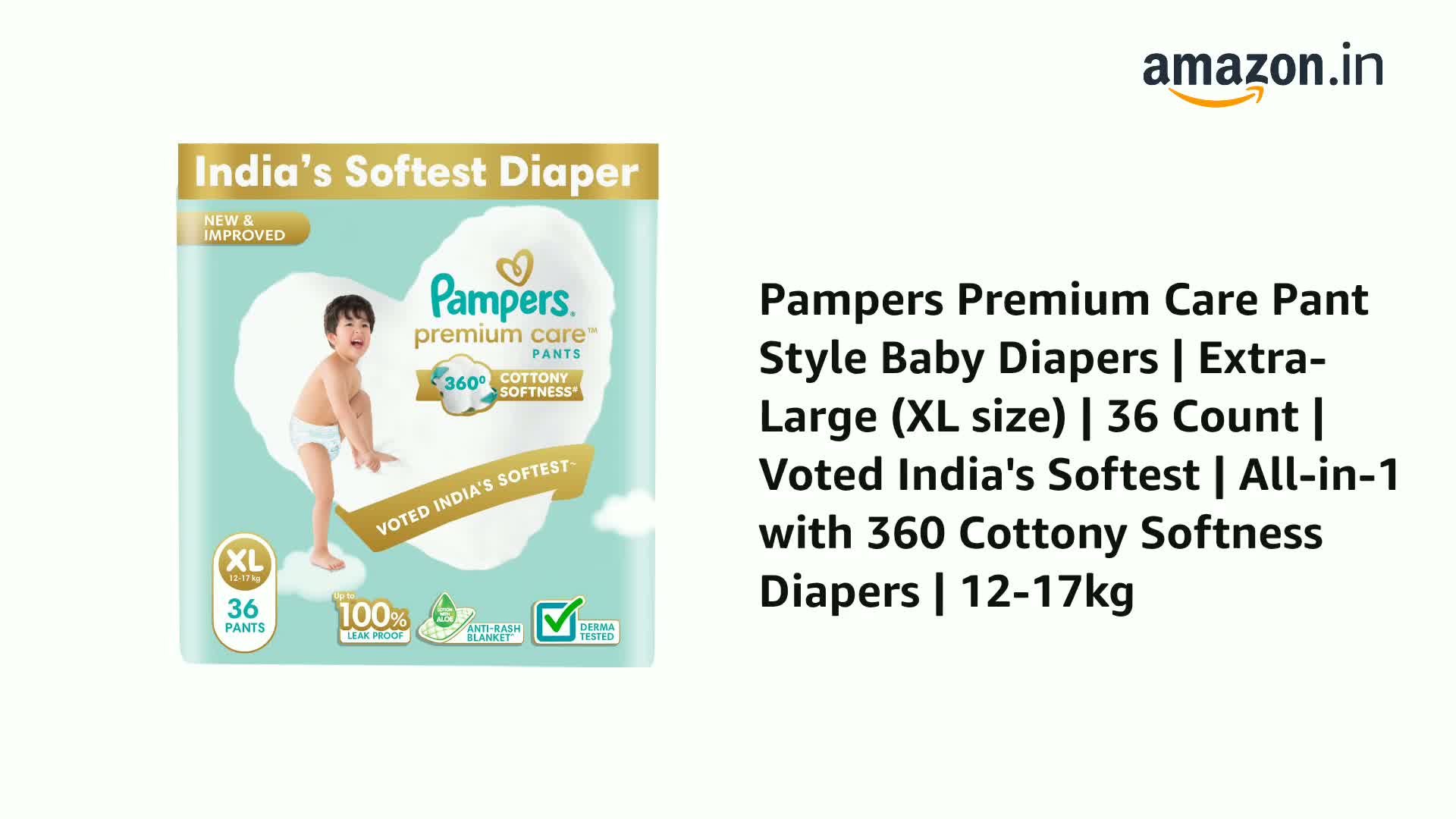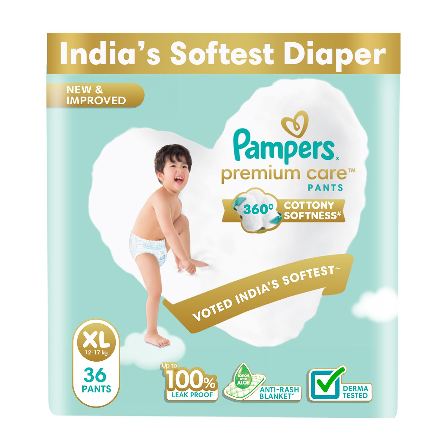New Pampers Premium Care Pants with 360 degree cottony softness gives your baby the ultimate comfort all day all night long. Pampers Premium Care Pants contain soothing lotion with Aloe Vera to protect your baby skin from rashes while its 10 million micropores allow your baby skin to breathe. Its 12-hour leak lock facility keeps your baby dry and away from wetness. Experience 5-Star comfort with unique added features like Wetness Indicator which turns Yellow to Blue indicating when you may change the diaper and a Disposal Tape to help you with easy disposal. Pampers Premium Pants are available in New-born (NB) S M L XL and XXL sizes.
