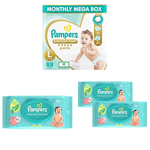 Pampers Premium Care Pants Diapers Monthly Box Pack, Large, 88 Count & Pampers Aloe Vera Baby Wipes - 72 Count (Pack of 3)