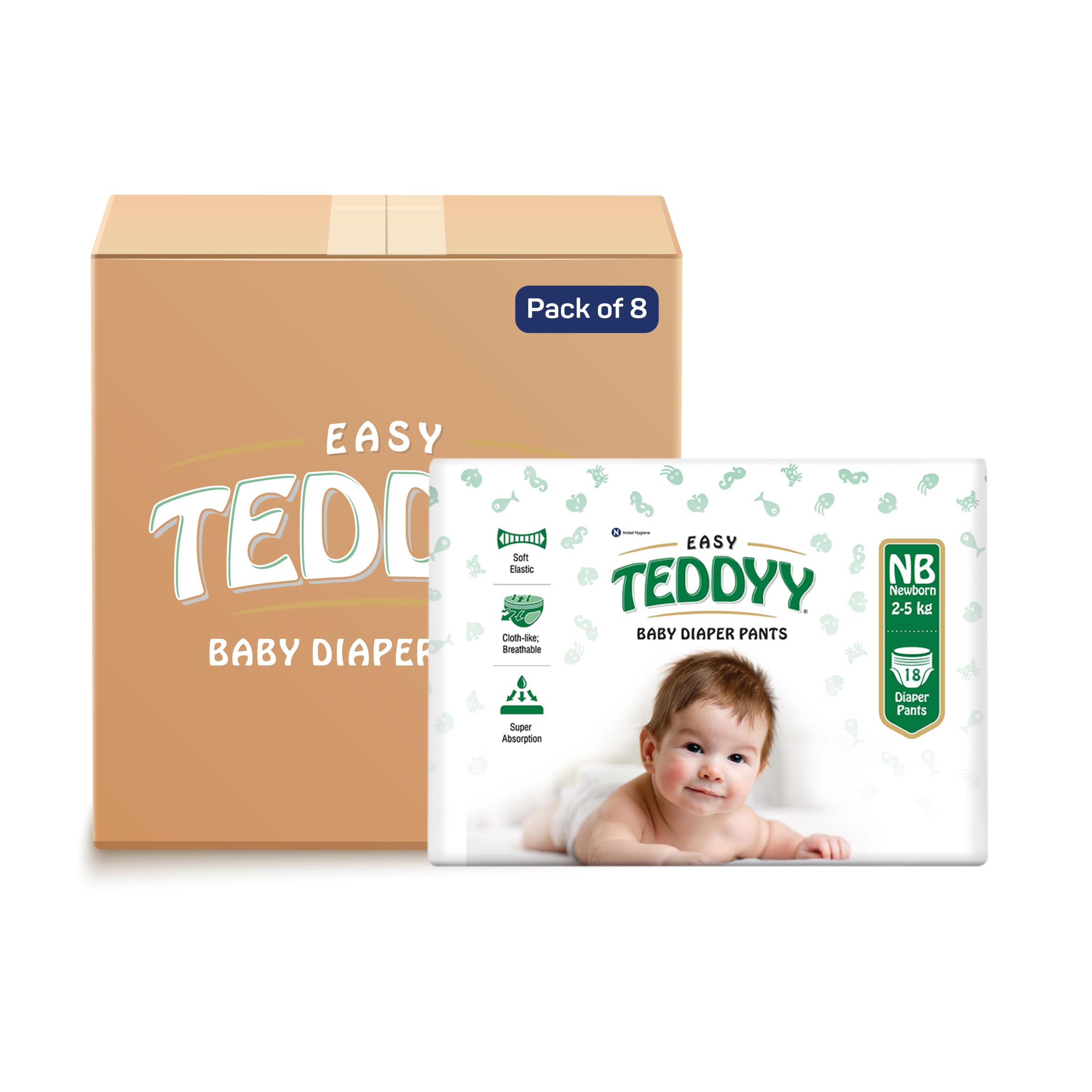 TEDDYY Baby Diapers Pants Easy New Born 144 Count (Pack of 8), Upto 5 kgs, 12 hrs Leak Protection, Anti - Bacterial