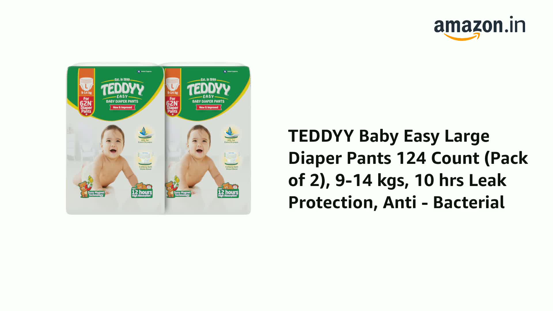 TEDDYY Baby Easy Large Diaper Pants 124 Count (Pack of 2), 9-14 kgs, 10 hrs Leak Protection, Anti - Bacterial