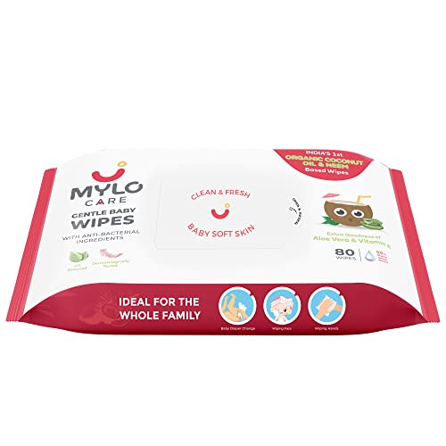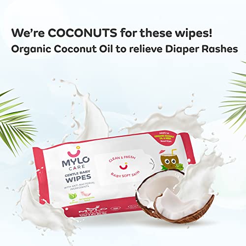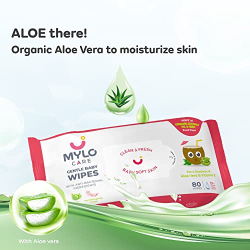 Mylo Gentle Baby Wipes Non-Lid (Pack of 1) | 80 Wipes per pack | Organic Coconut Oil, Neem, Aloe Vera, Vitamin E | 98% Pure Water