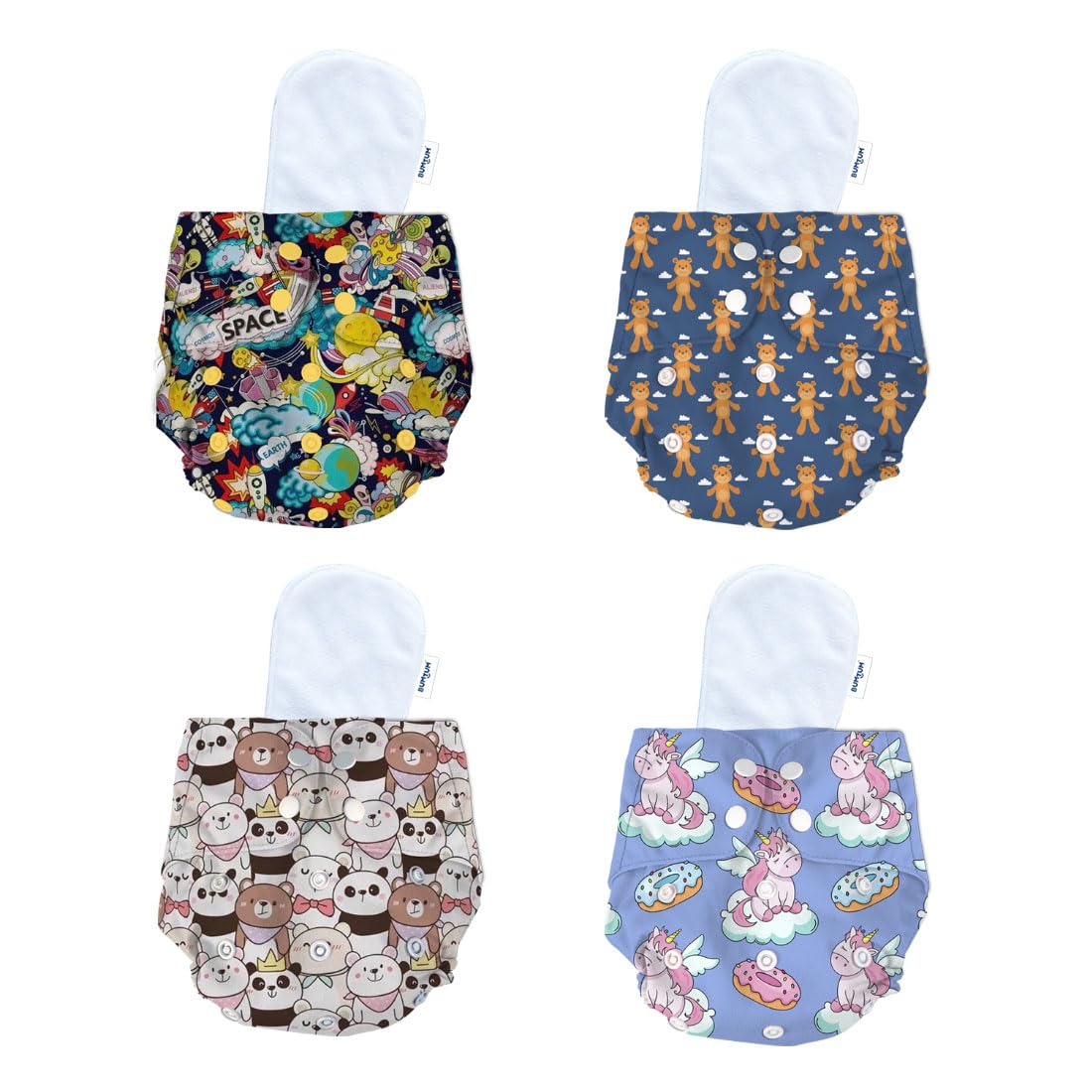 Bumtum Baby Diaper | 0-3 Yrs Baby Freesize | Pack of 4, New Born Baby Diaper, Cloth Diaper, Waterproof Reusable Diaper, Washable, Cotton, Extra Soft (Teddy, Unicorn, Teddy Face & Space Old)