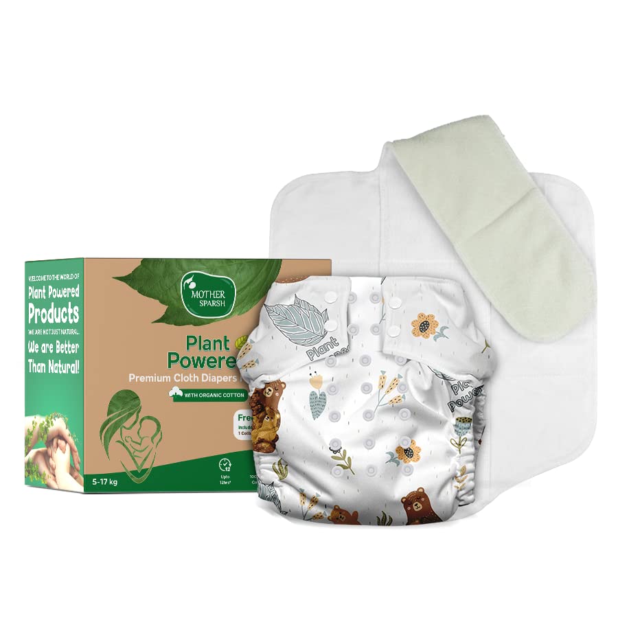 Mother Sparsh Plant Powered Cloth Diaper for Babies-Free Size | Medical Grade Fabric with 100% Organic Cotton | 13 Layer Breathable Soaker With Built-In Booster Pad (BearyHugs)