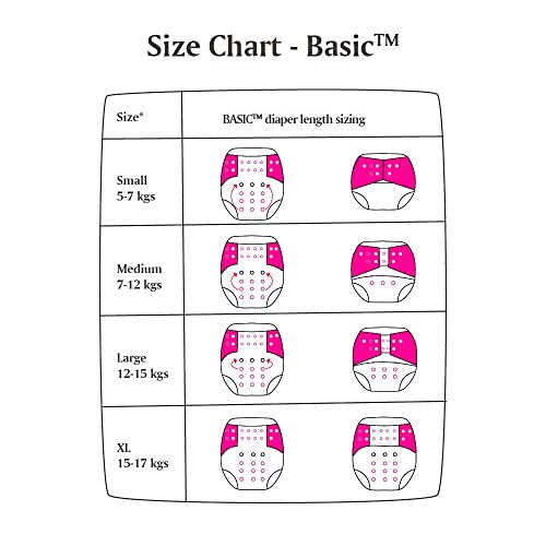 WATERPROOF ADJUSTABLE FREESIZE REUSABLE - Basic cloth diapers fit babies from 5kgs to 17kgs. You can easily adjust the size of the diaper to Small/Medium or Large/Extra Large depending on your baby's weight by snapping the buttons in the front. This helps