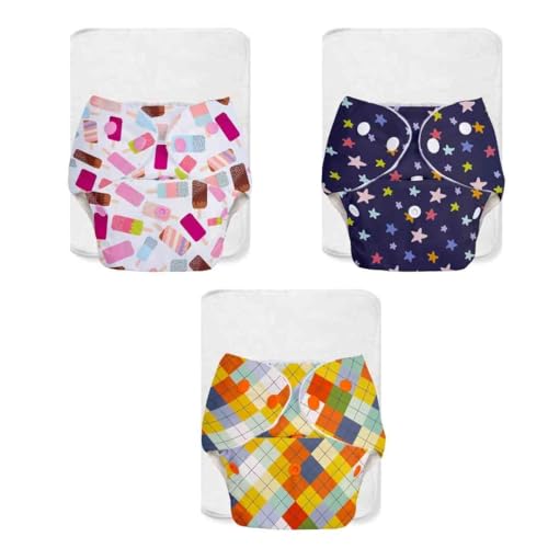 SuperBottoms BASIC Assorted Pack of 3 Diapers with 3 Dry feel Inserts - Freesize cloth diapers | Reusable cloth diapers for babies - Fits babies from 0-3 years - 5-17kgs | Option 4