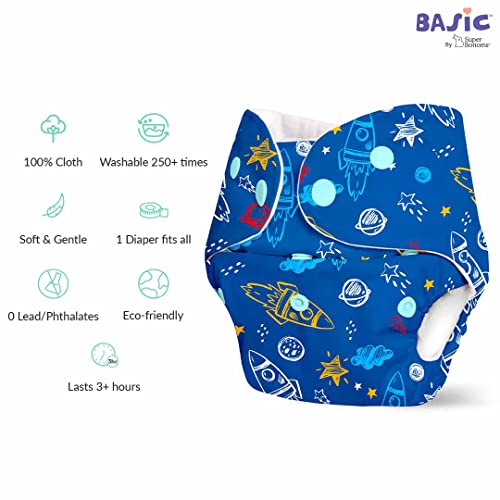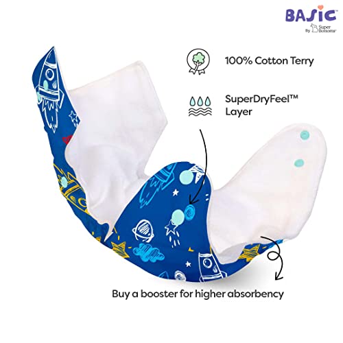 SuperBottoms BASIC Cloth Diaper For Baby | Washable & Reusable Cotton Cloth Diaper | 0-3 Years | Freesize | Adjustable | Reduces Rash | With 2 Quick Dry Pad/Insert | Space |