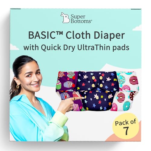 SuperBottoms BASIC Cloth Diaper | Side Leakage Proof Reusable Cloth Diaper with Quick Dry UltraThin pads|Freesize, Rash Free,for Kids 0-3 Yrs|Stay Dry & Lasts up to 3Hrs - (Assorted) (Basic Pack of 7)
