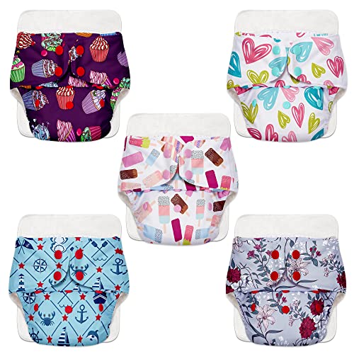 CONTENTS : Pack of 5 cloth diapers for babies with 5 dry feel inserts / Soakers.