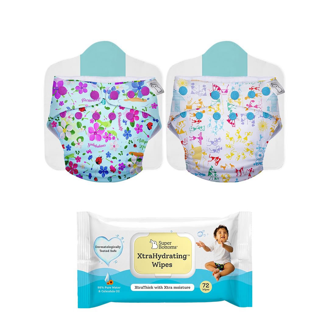 SuperBottoms Pack of 2 Cloth Diapers for babies and XtraHydrating¢ Wipes-72 Pack-Freesize Washable & Reusable waterproof Adjustable cloth diaper for babies from 5-17kgs|Diaper with 2 Dry Feel Pad