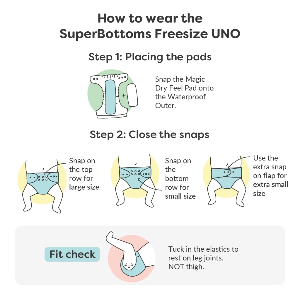 HomeBabyDiaperingCloth DiapersSuperBottoms Stash Builder Pack with 3 Freesize UNO- New version| Cloth diapers combo for babies from 3M to 3Y |With 3 Fleece liners, 2 Booster Pads & 1 Very Heavy Wetter Pad (hemp insert)