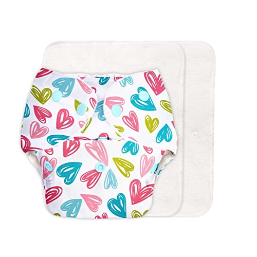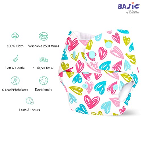 SuperBottomsBASIC Cloth Diaper For Baby | Washable & Reusable Cotton Cloth Diaper | 0-3 Years | Freesize | Adjustable | Reduces Rash | With 2 Quick Dry Pad/Insert | Hearts |