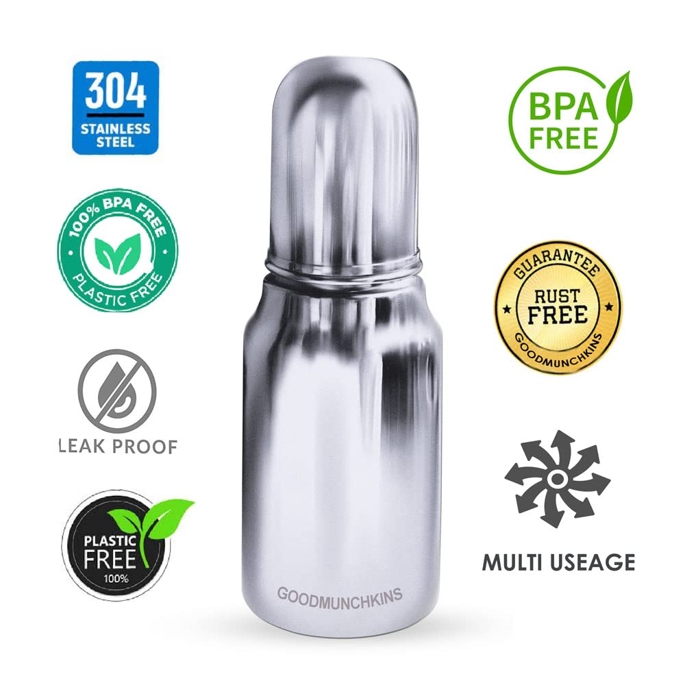 GOODMUNCHKINS Stainless Steel New-born Baby Feeding Bottle with Anti Colic Silicone Nipple with Nylon Bristle Bottle Cleaning Brush. We have two sizes in delux model i.e. 220ml 250ml Premium Mirror finishing in which we can store Milk/Water/Juice/Soup. Easy to hold for your Baby. Superior Lightweight Quality 304 Food Grade Stainless Steel Rust Free Product considering Health and Hygiene of your Baby The Nipple of the Bottle is made of Food Grade Silicon material. Spill-Proof Screw Type Nipple Cap and Push type outer lid makes the bottle completely leak-proof. Extra soft medical-grade silicone spout provides an easy transition from bottle-feeding. Free of - Biphenyl-A (BPA) phthalates nitrosamines lead PVC PET and biologically harmful chemicals. Free of BPA lead PVC nitrosamines phthalates PET and biologically harmful chemicals. Easy to Carry Easy to Handle and Easy to Clean. No smell. No mess. Smooth Design with no sharp curves or edges keeping in mind Easy and Safe cleaning of the bottle. The bottle is of sleek design and is very convenient while handling. Reduces sterilization work. Only Silicon Nipple needs to be sterilized. The bottle can be washed with soap and water ready to use again. A GOODMUNCHKINS Made in India Product