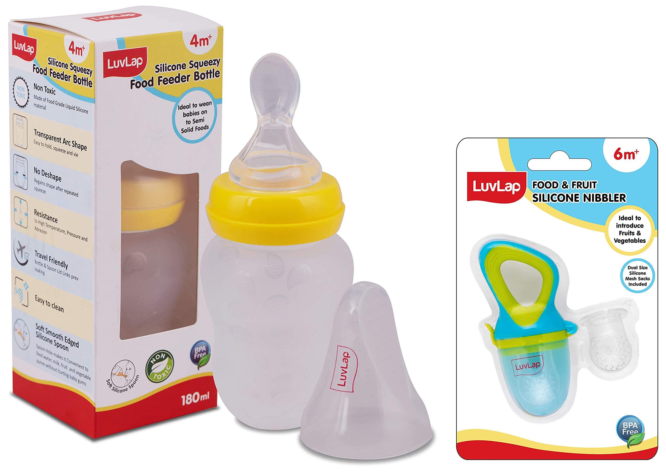 LuvLap Silicone Food/Fruit Nibbler with Extra Mesh Soft Pacifier/Feeder Teether for Infant Baby Infant Elegant Blue BPA FreeFruit nibbler and teething toy to provide gentle relief to gums. Serves dual purpose of feeding fruit and vegetables to babies and can also be used as a teether. Can be filled with chilled fruits/vegetables to provide added relief. Made with bpa free food grade plastic and soft silicone it comes in attractive handle designs to EN gage the baby and is easy to hold and nibble upon.LuvLap Baby Training Toothbrush Set with Anti Choking Shield Teeth Tongue Cleaner Baby Oral Hygiene 3 pcs (White/Orange)Lifes little stories bloom with coming of the little one in your life. It completes your life with many joys of parenthood. For baby its the next best thing to being in your arms. Entertain your little one and give him or her a personal resting place. Luvlaps high chairs cots walkers and other indoor products will have the whole household floored by babys happy smiles and chuckles. At Luvlap we endeavour to weave the little stories into our products with an emphasis on child safety and enrichment of features. So that your little one gets the comfort thats next only to the warmth of your lap. Conceived with care and made using the latest marvels of science all Luvlap products undergo multiple quality checks before they are dispatched to the stores. The products are available at all leading baby gear and online stores and conform to the european standards.LuvLap Baby Finger Toothbrush with caseMade from Non Toxic Liquid Silicone. Gently cleans your baby's teeth and gum. Provides relief to the child's tender gums during teething. Includes case for storage and to maintain hygiene.