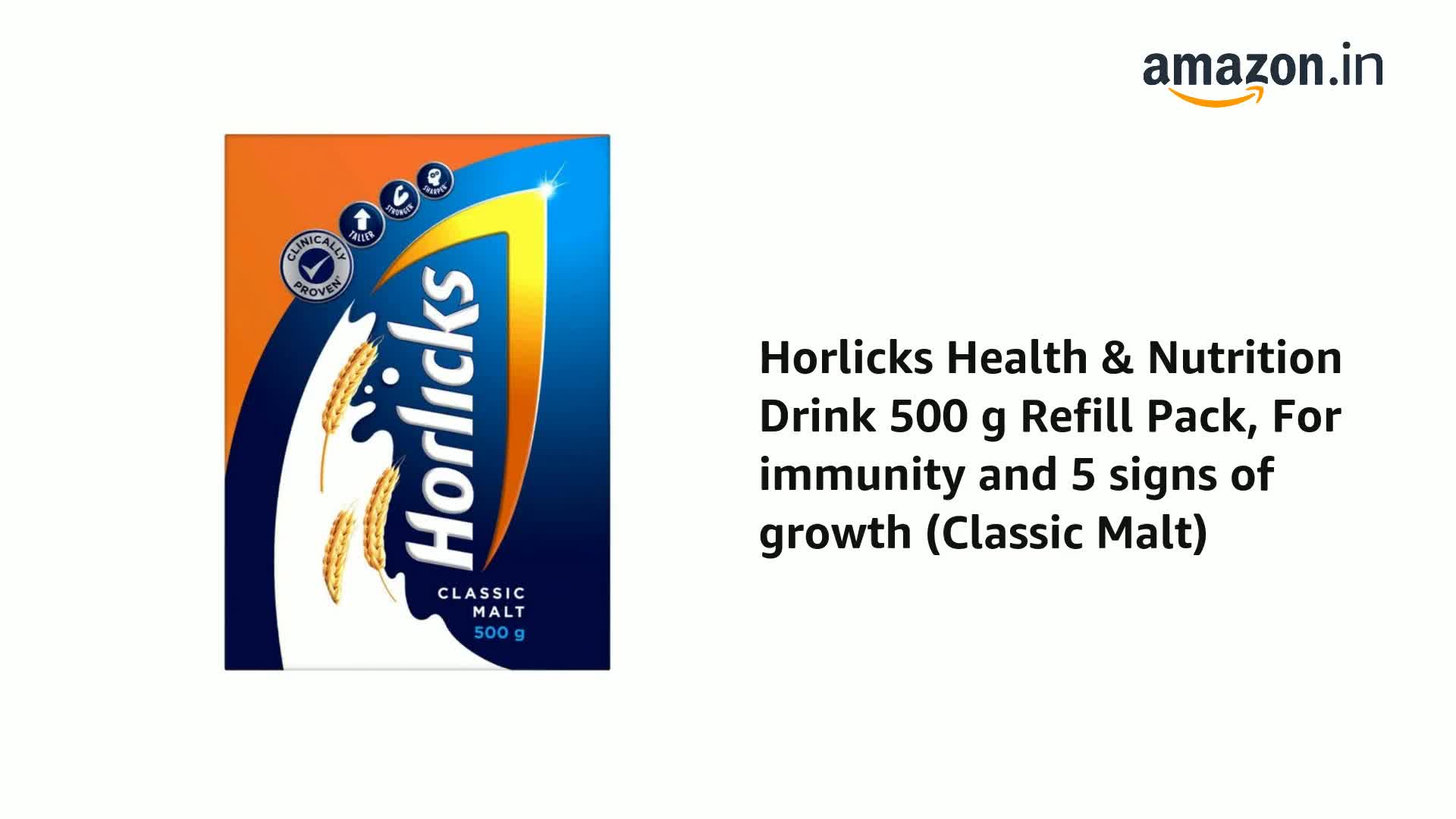 Horlicks is a comprehensive kids nutrition drink that provides a range of essential nutrients to support immunity growth and development. Horlicks protein drink for kids is clinically proven to improve 5 signs of child growth and Horlicks has been scientifically formulated to make kids taller stronger and sharper. This health mix powder is available in four delicious flavours - classic malt chocolate elaichi and kesar badam. Whether enjoyed with a cup of hot or cold milk Horlicks is a leading force in the 'Science of Food' and provides a tasty and convenient way to support your health and well-being. This children health drink has bio-available nutrients that are easily absorbed by the kid's body and carried to all parts of the body through the bloodstream.Horlicks contain nine essential nutrients for better concentration including Vitamins B6 B12 C D Copper Folic Acid Iron Selenium and Zinc - scientifically proven to support immunity. Additionally Horlicks protein drink for kids 10 year or in their growing phase increases the density of minerals such as calcium in bones to give children bigger and stronger bones.Is Horlicks truly healthy as a nutrition drink for kids?Horlicks is clinically proven to increase lean tissue making children stronger. It helps improve attention and concentration to make your child sharper. Horlicks is clinically proven to enhance haemopoietic nutrients in the blood. Healthier Blood refers to improvement in the levels of blood health related nutrients (Vitamin A & Folate) in circulation. Finally Horlicks is clinically proven to increase fat-free mass making children stronger. So if you're looking for a tasty and convenient way to support the health and well-being of your little one give Horlicks a try today!