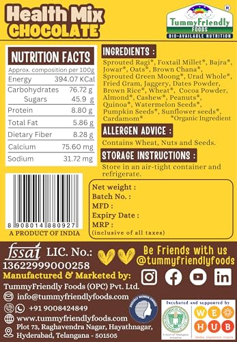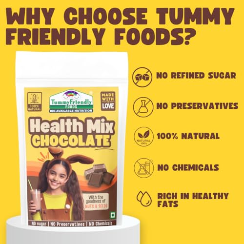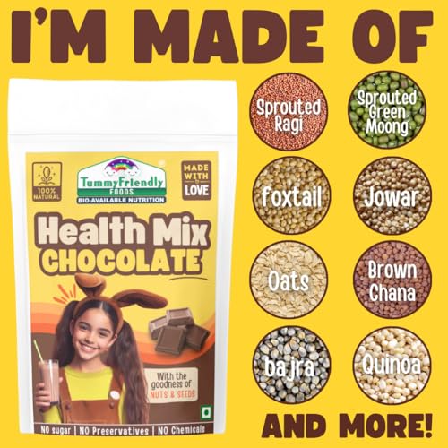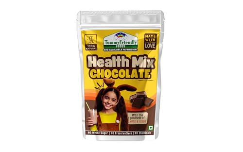 TummyFriendly Foods Organic Chocolate Health Mix For Kids - 400g (100g each pack). Introducing our Organic Multi Grain Health Mix Powder - the ultimate health drink for kids! Crafted with care and packed with goodness this nutritious blend is specially formulated to provide essential nutrients for growing children. Say goodbye to sugar worries! Our health drink for kids without sugar offers a healthy option for parents seeking wholesome alternatives. Made with natural ingredients it's a deliciously healthy choice that kids will love. Created with the well-being of children in mind our health mix for kids is homemade with love. We understand the importance of nourishing your little ones with the best which is why our blend is free from artificial additives and preservatives. Suitable for ages 2-6 years our health mix for kids malt is designed to support their growth and development. With a rich combination of grains it's a powerhouse of nutrients that helps fuel their active lifestyles. Looking for a Healthy Milk Mix powder for kids? Look no further! Our Health mix for kids is the perfect solution. Packed with vitamins and minerals it's an easy and convenient way to ensure your child gets their daily dose of goodness. Make the switch to our Organic Multi Grain Health Mix Powder today and give your kids the gift of health and vitality. With every sip they'll be nourished energized and ready to take on the world!