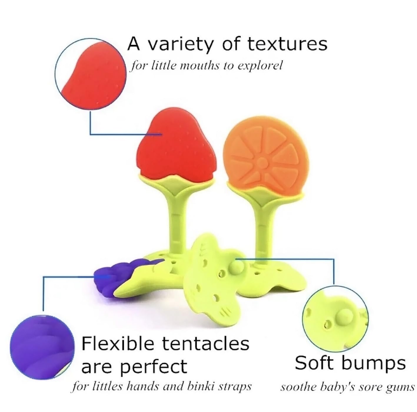 100% SAFE FOR YOUR BABY- Our baby teething toys are carefully made with soft and chewable silicone for the comfort and safety of babies. Its materials are FDA-approved BPA-free toxin-free and dishwasher and freezer safe.It keeps your babies from suffering soreness and discomfort when their teeth start to develop. Our Silicone BPA-Free Natural Organic Teether for babies offer a safe and soothing solution for teething infants. Crafted from premium food-grade silicone and entirely free from BPA these teethers prioritize your baby's health and safety.Their organic composition ensures they are free from harmful chemicals providing a natural and eco-friendly option. The textured surface of this teether gently massages your baby's gums offering relief from teething discomfort.Their easy-to-clean design and diverse shapes make them convenient and engaging for both parents and babies.