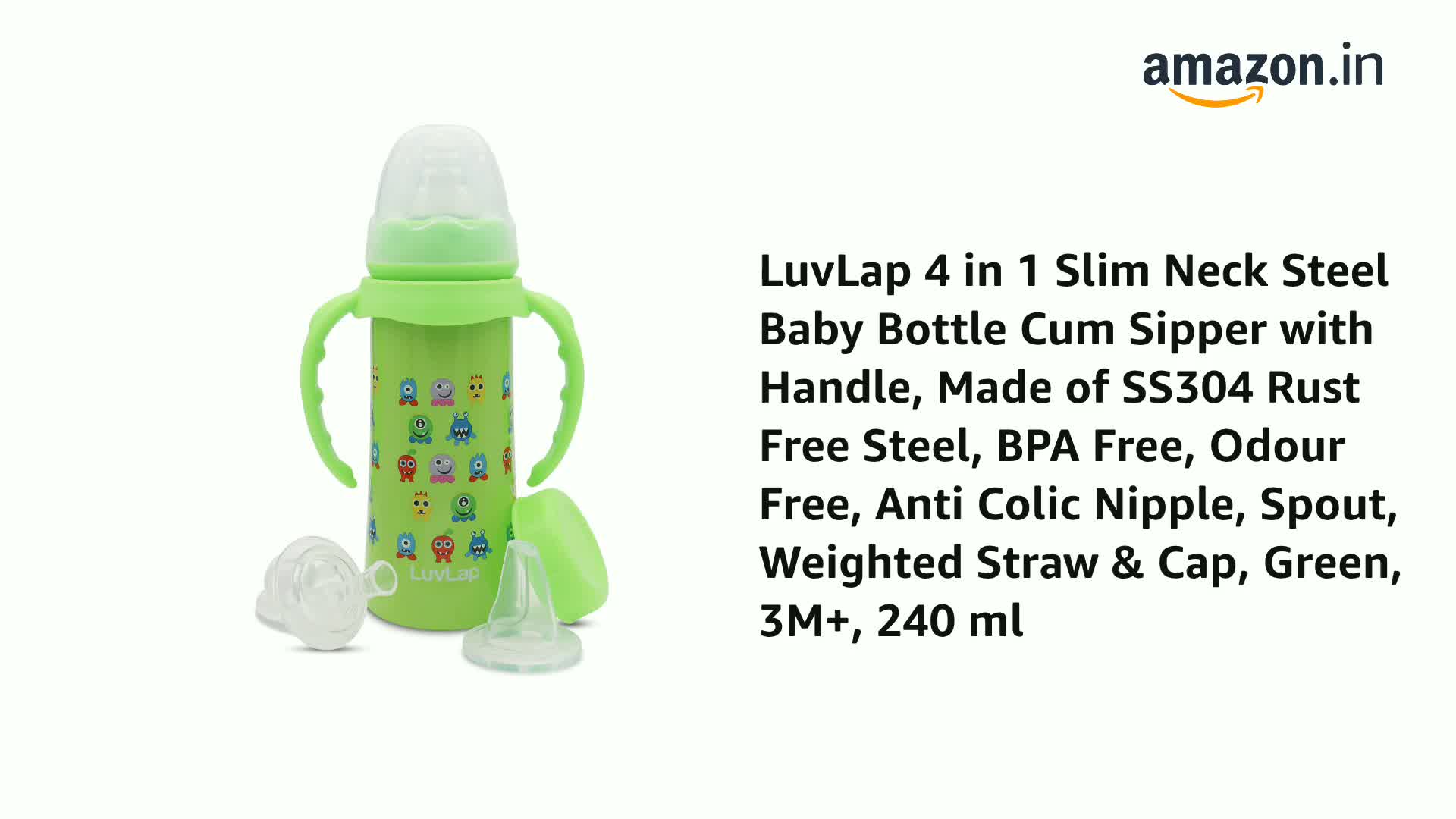 LuvLap 4 in 1 Steel Feeding bottles cum Sippers are ideal for a baby's consumption of mother's milk formula feed Juice and other liquids. The body of the sipper is made of rust-free SS304 steel. It is odor free also. The liquid in the sipper can be consumed through the nipple spout or Straw. All these come with an anti-colic venting system. Moreover he/she can sip from it directly once they are trained to sip from a tumbler.