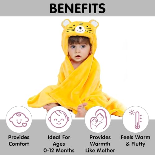 OYO BABY Hooded Baby Blankets for New Born Babies | Super Soft Baby Wrapper Baby Sleeping Bag for Baby Boys Baby Girls Babies (86cm x82cm 0-12 Months Fleece Skin FriendlyYellow Tiger