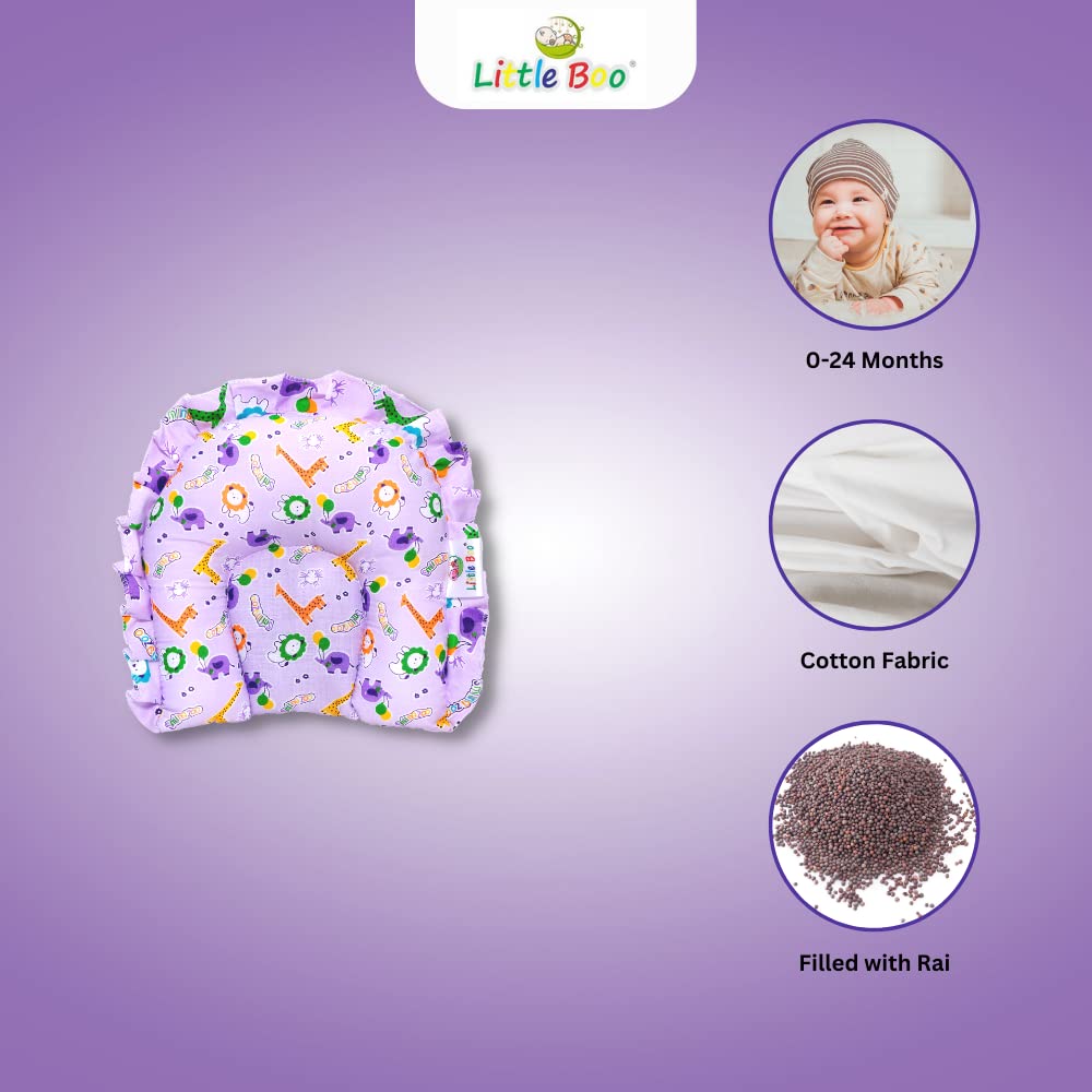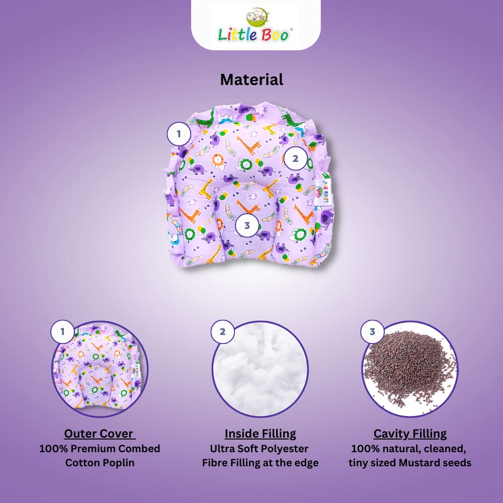 A must have our organic aromatherapy Baby First Newborn Pillow is the safest most ideal support for babies to sleep on. Inspired by traditional Ayurvedic remedy this mustard Seed filled helps to dramatically reduce head pressure aiding in the prevention and correction of flat head syndrome. Filled with selective 'tiny sized' Rai Sarso seeds for optimum customized support and premium quality aromatic Lavender flowers for deep sound sleep our specially engineered ultra soft cotton pillows are irreplaceable. A baby's bones including the skullcap (top part of head) are soft and flexible and not fused together. It takes approximately 12 to 24months to strengthen and fuse into one. During this time to prevent and treat flat head caused by constant pressing against bedding to help with irregular head forms caused by childbirth and to provide customized sleep support the Baby's First Pillow is invaluable. Mustard seeds are traditionally believed to be a constant source of bio energy helping to increase blood circulation reduce ear infections calm colic and soothe sinuses while evenly distributing pressure around the baby's delicate head Neck Support.