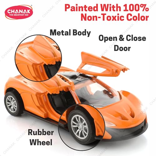 Chanak Premium Metal Die-Cast Sports Racer Car Metal Car with Realistic Engine Sound LED Lights Open & Close Doors Pull Back Car Zinc Alloy for Kids Above 3 Years BIS Approved (Orange)
