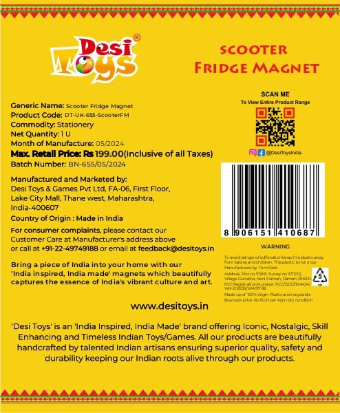 HomeBabyToys & GamesToysDesi Toys Scooter Fridge Magnet Made in MDF | Design Inspired by Indian Culture | Souvenir | Ideal for Gifting | Vibrant Art | Home & Kitchen Decor Item | Cute & Durable | 3 x 2.3 Inc